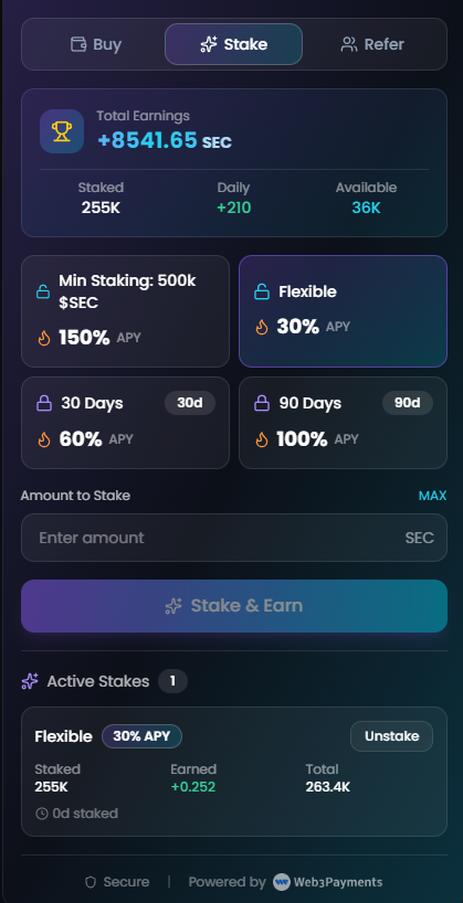 Stake your $SEC and watch your rewards grow in realtime. Choose between flexible or locked plans while staying fully non-custodial.